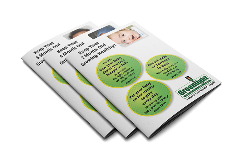 The booklets are the centerpiece of Greenlight. Specially designed age-specific booklets help parents focus on the most important things they can do to keep their child growing healthy and strong.